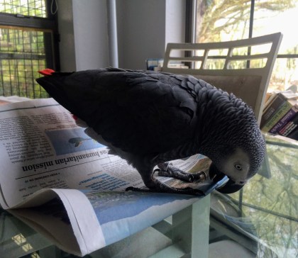 Bowie – Congo African Grey has joined Gina and Marcos in Tucson with their adorable Coconut the U2 (Umbrella Cockatoo)!!! :)